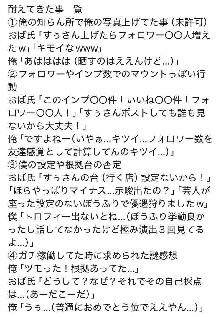 ---- の発言 この時、自分はもう一切支援することないと決めました (Xミュート) ◆火曜日の件 お仕事帰りに蒲田のホールに寄ると彼を発見 もう打たないと聞いてましたが打ってる目撃報告は聞いていたので驚きはしませんでしたが。。 せっかくなので隣で並びしながら 嘘は良くないよ、人が離れてしまうよ と繰り返し伝えたつもり すると勝ってるので奢るから1軒行きましょうよと提案受けて飲むことに まぁ飲みの場は良かったのですが タクシー降りてから