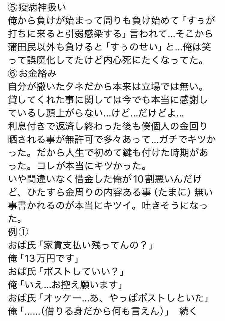 ・期待値ある所だけ打つ 別に打ち方なんて好きなようにすれば良いのにそう言うから出来る限り曜日や日付毎の狙い目は共有してたつもり だけど彼の行く店は今まで通り何も変わらず 挙句の果てに彼主催のBBQ当日に支払いと3日で10万負けて金がないからと土下座スタート (費用立て替え) この時にもう自分に出来るとは実家に連絡するしか無いなと思ってました (この時点では実家支援済みなのを聞いてなかったので) 実際には支援されたのも使い込んで手持ち無し。。 ◆蒲田八幡お参りの件 前日に蒲田勢から彼についての相談 電気・水道止められそうだから金を貸して欲しいと連絡が来たと (正しくは携帯代だったらしい) 年下のフォロワーさんに金貸頼むのはさすがに無いと思い再度出馬 この時の彼は10月の負けでもう打つ気力も無いし二度と打たないと宣言 また、食べる物にも困っていると。。 さすがに助けるよ そんな話を聞いた物だからその日以降 また、食べる物にも困っていると。。 さすがに助けるよ そんな話を聞いた物だからその日以降