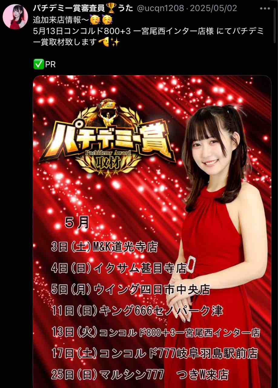 — うた👩🏻🍳🥝ଘ週末パチンコ女子ଓ (@syumatsup3uta) May 17, 2025