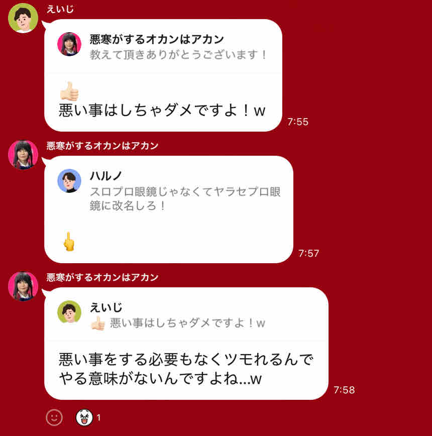 現在はメッセージなどが削除されているが、スロプロ眼鏡さんの横顔(盗撮?)をアイコンにして揶揄するような発言をしていた模様↓