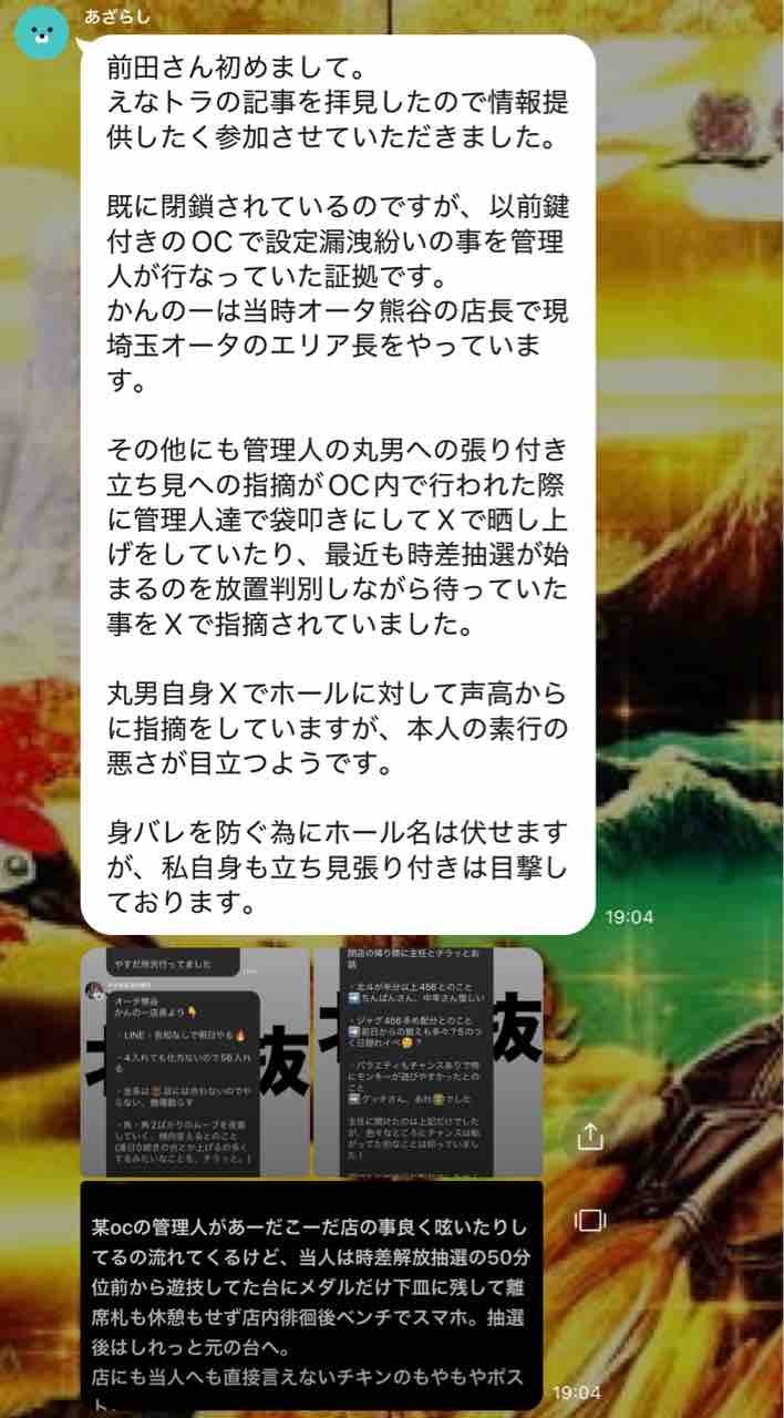 先程全力パチスロ部というオープンチャットで私の名前をもじり、しかも横顔をトップ画にしてたスロプロ無職っていう方。